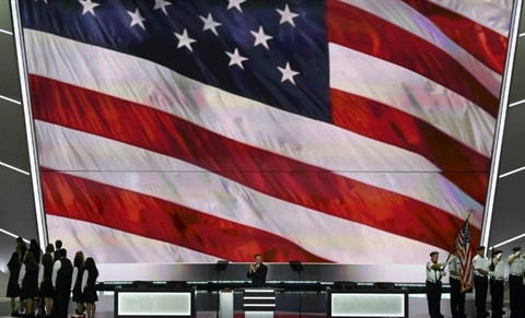| Des anciens combattants tiennent le drapeau américain sur la scène de la convention républicaine, le 18 juillet à Cleveland. |
