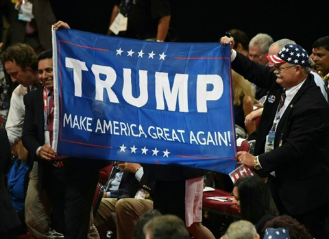 | Des délégués déploient une banderole de soutien à Trump à la Convention républicaine, le 18 juillet à Cleveland (Ohio). |