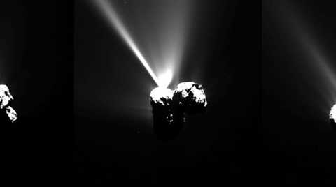 La sonde européenne Rosetta a assisté au spectacle à une distance prudente de 330 kilomètres. Il fallait en effet que ses capteurs d'étoiles, qui lui permettent de s'orienter, ne soient pas perturbés par les débris et poussières qui s'échappent de plus en plus de la comète en raison de la proximité du Soleil.