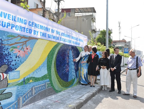 | La fresque en céramique présentant des traits culturels, architecturaux et naturels de Taïwan (Chine), inaugurée le 9 août dans la "Route de la céramique au bord du fleuve Rouge". |