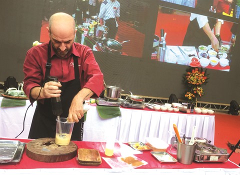 | Le chef Hervé Rodriguez prépare un plat à partir d’œufs lors d’un festival gastronomique à Hanoï. |