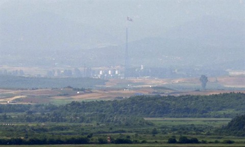 | Drapeau nord-coréen à la frontière entre les deux Corées, le 17 juin 2020. |