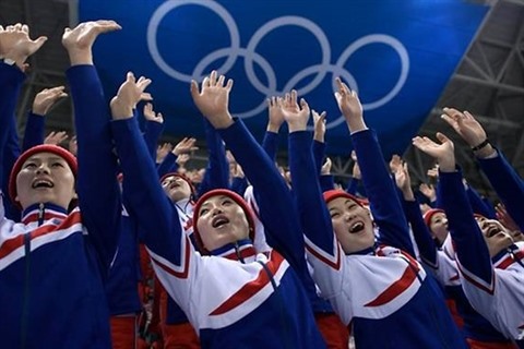 | Des supporteurs de la RPDC lors des JO de Pyeongchang. |