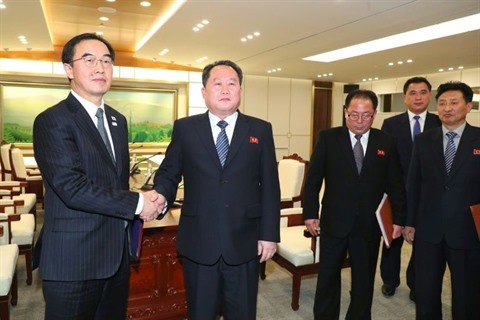 | Poignée de mains entre le chef de la délégation nord-coréenne Ri Son-Gwon (droite) et son homologue du Sud, Cho Myung-Gyun, à Panmunjom, le 9 janvier. |