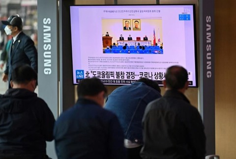 | Des personnes regardent à la télévision les informations sur la décision de la RPDC de ne pas participer aux Jeux oymiques de Tokyo, le 6 avril à Séoul. |