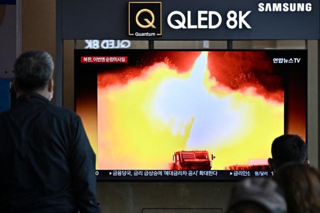 | Des images d'un tir de missile nord-coréen diffusées sur un écran de télévision dans une gare de Séoul, le 13 octobre en Corée du Sud. |