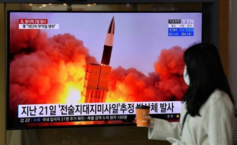 | Une femme passe devant un écran de télévision diffusant des images d'un tir de missile nord-coréen, le 29 mars dans une gare de Séoul, en R. de Corée. |