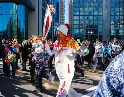 | Le secrétaire général des Nations unies, Ban Ki-moon, avec la flamme olympique à Sotchi. |