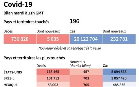 Malgré ces possibles avancées sur le front d'un vaccin, le virus continue sa progression dans le monde. Plus de 20 millions de cas ont été officiellement recensés dans le monde, dont plus de la moitié en Amérique, selon un comptage réalisé par l'AFP.