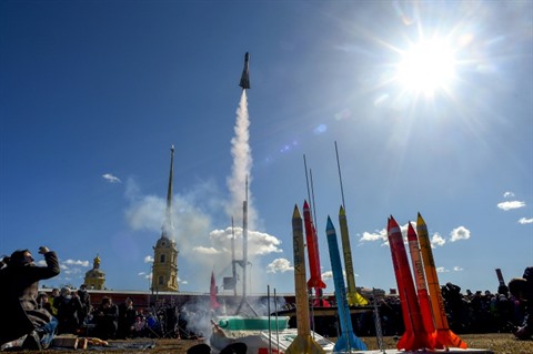 | Des spectateurs regardent le lancement de modèles réduits de fusées, à Saint-Pétersbourg, le 11 avril. |