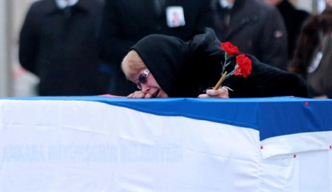 | Marina Karlova, veuve de l'ambassadeur russe en Turquie assassiné, devant le cercueil de son mari à Ankara, en Turquie, le 20 décembre. |