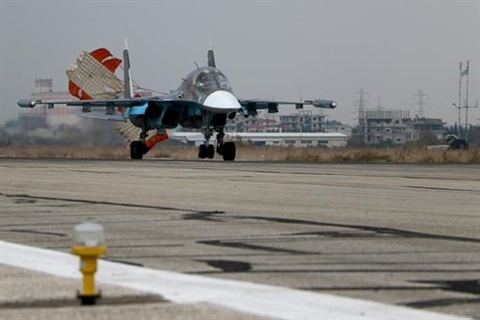 | Un chasseur russe Sukhoi, Su-30SM, aterrit sur la base de Hmeïmim, dans la province de Lattaquié, dans le Nord-Ouest de la Syrie, le 16 décembre 2015. |