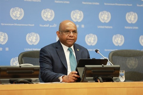 | Abdulla Shahid lors d'une conférence de presse au siège de l'ONU à New York. |