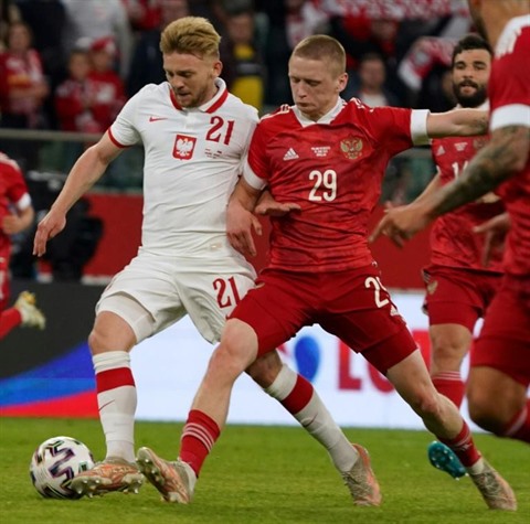 | Le Polonais Kamil Jozwiak, à la lutte avec le Russe Maksim Mukhin, lors de leur match amical, le 1er juin 2021 à Varsovie, en guise de préparation pour l'Euro. |
