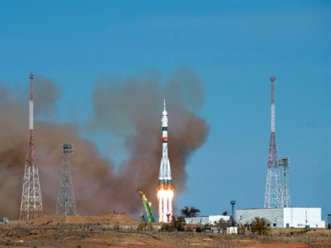 | Décollage d'une fusée Soyouz depuis le cosmodrome de Baïkonour, en octobre 2020 au Kazakhstan. |