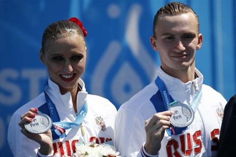 | Aleksandr Maltsev et Mikhaela Kalancha sacrés en duo mixte de la natation synchronisée, le 22 juillet à Budapest. |