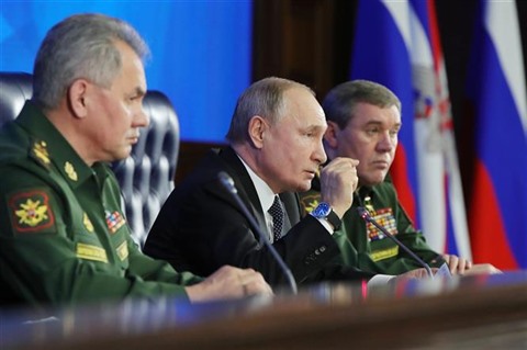 | Le président Vladimir Poutine (centre) au cours d'une réunion élargie du conseil du ministère de la Défense russe, le 24 décembre à Moscou. |
