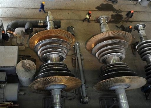 | Des ouvriers assemblent des turbines dans la centrale nucléaire d'Udomlya (Russ |