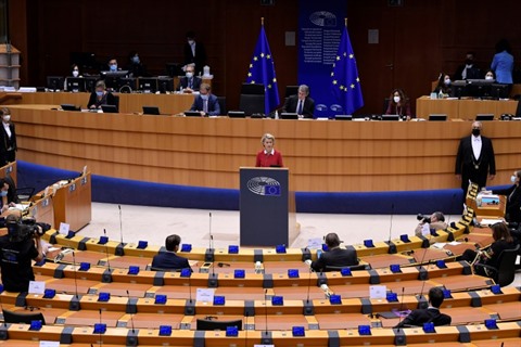 | Le présidente de la Commission européenne Ursula von der Leyen (centre) fait une déclaration lors du débat au Parlement européen sur l'accord commercial de l'UE avec le Royaume-Uni, le 28 avril à Bruxelles. |