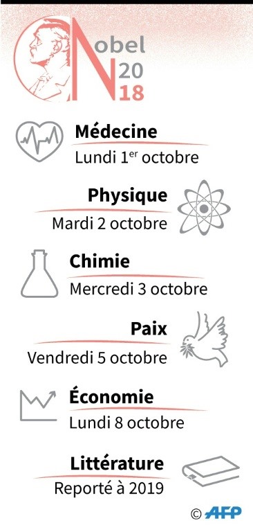Après la médecine annoncée à 11h30 (09h30 GMT) à Stockholm suivront la physique mardi, la chimie mercredi et l'économie lundi 8 octobre. Entretemps à Oslo, le 5, sera dévoilé le lauréat du Nobel de la paix.