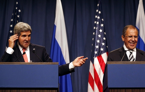 | Le secrétaire d'État américain John Kerry (gauche) et son homologue russe Sergueï Lavrov lors d'une conférence de presse, le 14 septembre à Genève. |