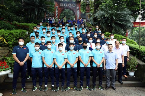 | La sélection nationale de football U23 au temple Thuong (Supérieur), situé au sein des vestiges historiques de ces rois fondateurs du pays, dans la ville de Viêt Tri, province de Phu Tho (Nord). |