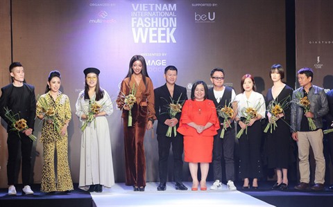 | Des stylistes vietnamiens et étrangers lors d'une conférence de presse pour annoncer la Semaine de la mode internationale, à Hanoï. |