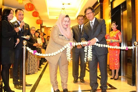 | L’ambassadeur du Vietnam en Indonésie, Hoàng Anh Tuân, et la directrice du Service de la culture et du tourisme de Semarang, Masdiana Safitri, inaugurent la Semaine de promotion de la gastronomie vietnamienne. |