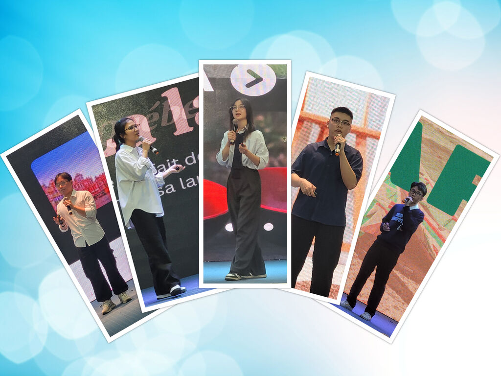 | Les cinq finalistes du concours d’orateur "Destinations francophones : découverte et inspiration". |