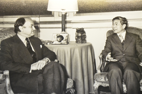| Entretien entre le ministre vietnamien des Affaires étrangères, Nguyên Co Thach (droite), et son homologue français, Claude Cheysson, le 9 août 1982 à Paris. |