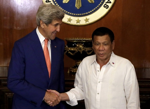 | Le président philippin Rodrigo Duterte (droite) et le secrétaire d’État américain John Kerry, le 27 juillet à Manille. |