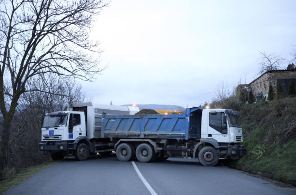 | Des camions utilisés pour barrer une route près du village de Rudare, dans le nord du Kosovo, le 10 décembre 2022. |