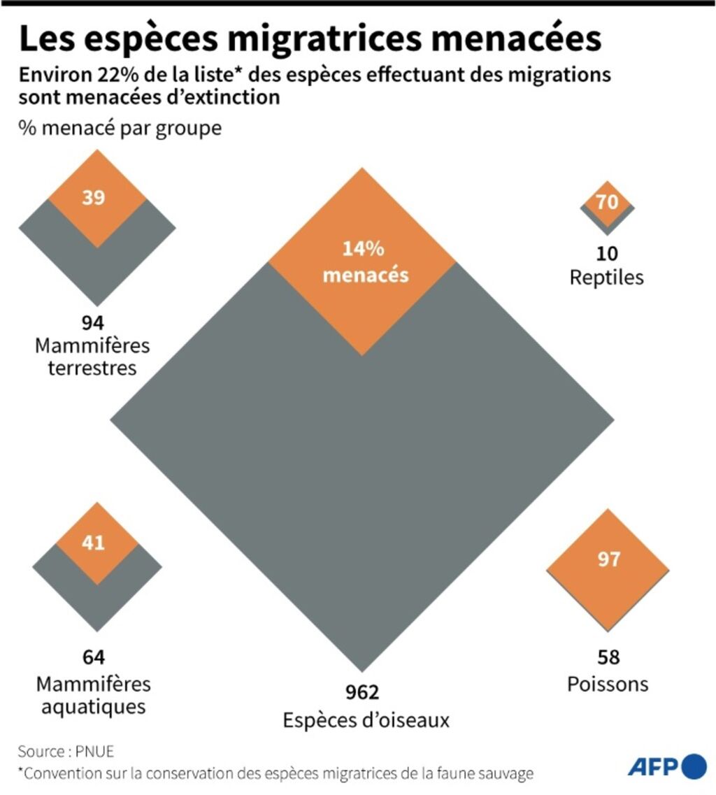 Parmi les espèces répertoriées par la Convention de Bonn de 1979 sur la conservation des espèces migratrices appartenant à la faune sauvage - qui publie le rapport -, une sur cinq est menacée d'extinction et 44% voient leur population décroître.