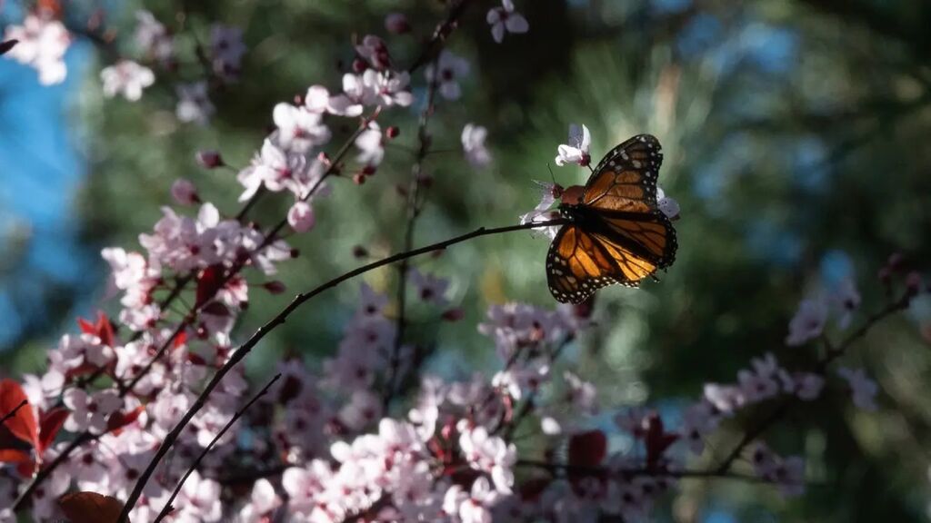 | Un papillon monarque butine des fleurs de cerisier alors qu'il hiverne dans le sanctuaire de Pacific Grove, à Pacific Grove, en Californie, le 26 janvier 2023. |
