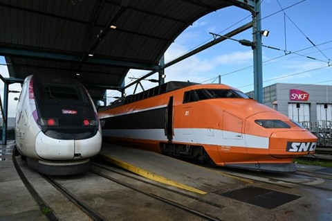 | "Patrick" (droite), premier TGV mis en service entre Paris et Lyon en 1981, à Saint-Denis, près de Paris le 25 février 2020, peu après sa mise à la retraite. |