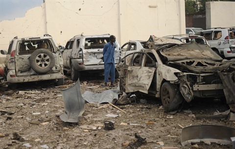| Des voitures ravagées lors d'un attentat le 22 mars à Mogadiscio, en Somalie. |
