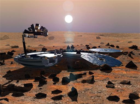 | Une vue d'artiste, réalisée en 2002, représentant la sonde Beagle 2 à la surface de la planète Mars. |