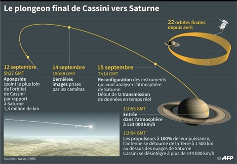 Cassini devrait perdre le contact avec la Terre deux minutes après le début de sa descente à 113.000 kilomètres/heure durant laquelle dix de ses instruments fonctionneront, dont le spectromètre pour analyser l'atmosphère.