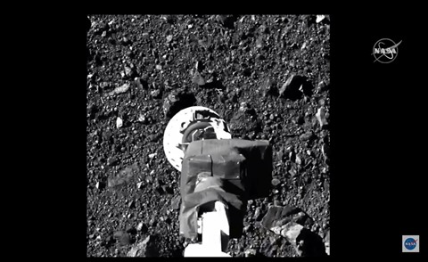 Les fragments se trouvent en ce moment dans le compartiment circulaire au bout du bras. Mardi 20 octobre, le bras s'est collé quelques secondes sur le sol de Bennu et a soufflé en même temps du gaz comprimé, faisant se soulever des particules qui ont été capturées à l'intérieur du bras, comme sous une cloche. Mais le bras s'est en réalité enfoncé de 48 cm en profondeur, à la surprise de la NASA.