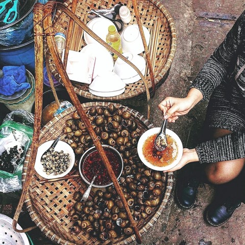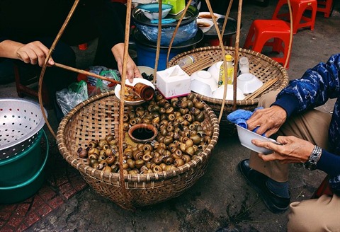 Assise sur le bord de l'allée 136, rue Tây Son à Hanoï, la vendeuse est occupée à décortiquer les escargots. Un des deux paniers de sa palanche en est rempli; l’autre contient une petite montagne de vermicelles de riz.
