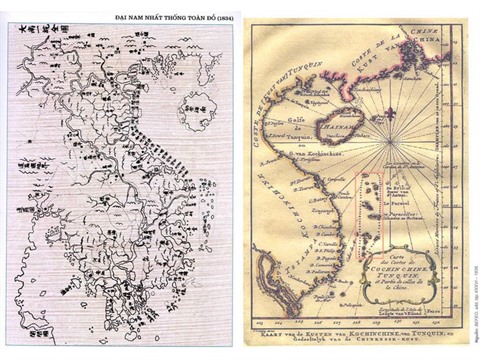 | De gauche à droite : la carte Dai Nam Thông Nhât Toàn Do ou Carte intégrale du Dai Nam réunifié (établie en 1834 par Phan Huy Chu) et la carte sur le Vietnam établie par les Occidentaux en 1749. |