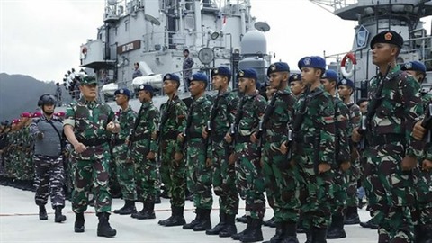 | Des troupes indonésiennes à la base militaire de Natuna dans les îles Riau, le 3 janvier. |