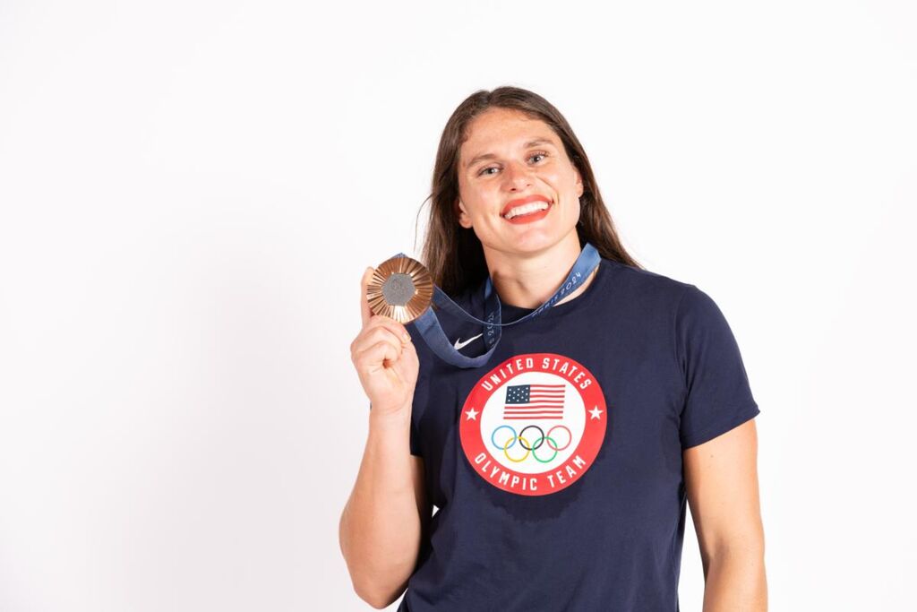 | Ilona Maher avec sa médaille de bronze olympique de rugby à VII le 31 juillet 2024 au Parc des champions au Trocadéro. |