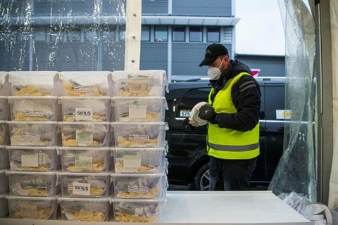 | Un homme prépare des kits de tests PCR qui doivent être envoyés par taxi à des personnes soupçonnant être infectées dans la banlieue de Stockholm, le 4 décembre. |
