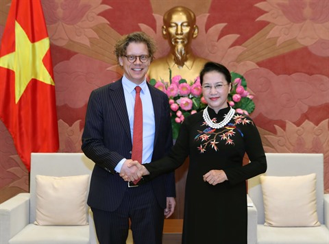 | La présidente de l’Assemblée nationale, Nguyên Thi Kim Ngân, et l’ambassadeur suédois, Pereric Högberg, le 17 février à Hanoï. |