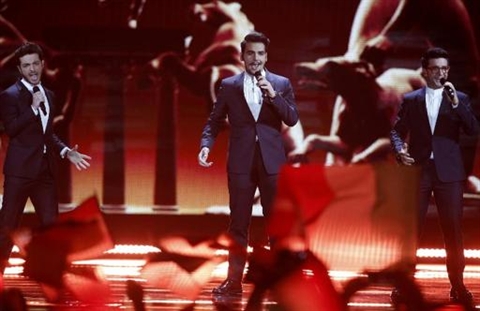 | Le trio italien Il Volo, troisième à la finale de l'Eurovision, le 23 mai à Vienne. |