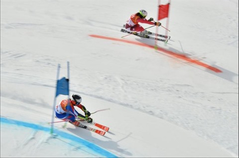 | La Française Tessa Worley (en bas) en demi finale du slalom parallèle des JO de Pyeongchang le 24 février 2018. |