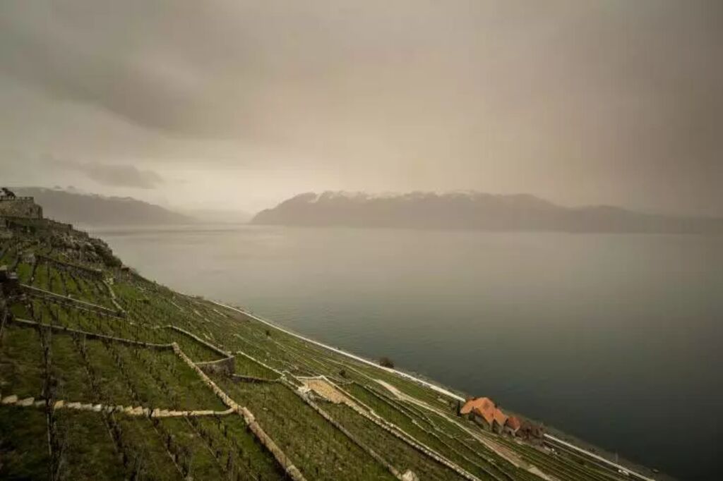 | La ville suisse de Chexbres, dans le canton de Vaud, enveloppée dans un voile de sable du Sahara, le 30 mars. |