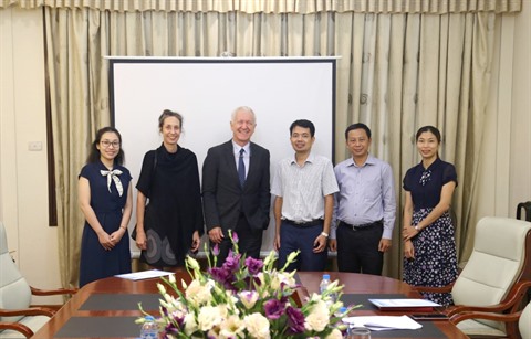 | L'ambassadeur de Suisse au Vietnam, Ivo Sieber (3e gauche), et son adjointe, Nicole Wyrsch, lors de la réunion avec NAFOSTED. |