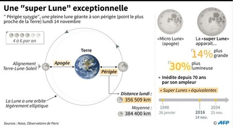 La Lune se trouve lundi 14 novembre à "seulement" 356.509 km de la Terre, contre une distance moyenne de 384.400 km. Il faut remonter au 26 janvier 1948 pour avoir une "super Lune" dont la distance avec la Terre soit inférieure, et il faudra attendre le 25 novembre 2034 pour que la Lune se rapproche davantage de la Terre, selon Pascal Descamps, de l'Observatoire de Paris.
